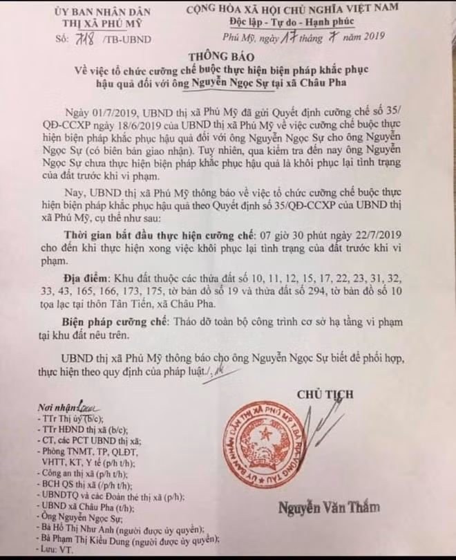 Ngày 20.7, thông tin từ UBND thị xã Phú Mỹ, tỉnh Bà Rịa-Vũng Tàu, cho biết ông Nguyễn Văn Thắm, Chủ tịch UBND thị xã Phú Mỹ đã ký quyết định số 718 về việc cưỡng chế buộc thực hiện biện pháp khắc phục hậu quả đối với ông Nguyễn Văn Sự tại xã Châu Pha.
