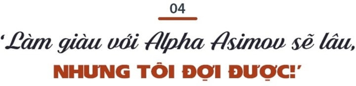 Co-founder này dẫn hình tượng, một cây cổ thụ mọc cả trăm năm nó mới to được, rễ mới bám chắc, cành lá xum xuê và khẳng định: “Làm giàu với Alpha Asimov sẽ lâu, nhưng tôi đợi được! (cười)”.