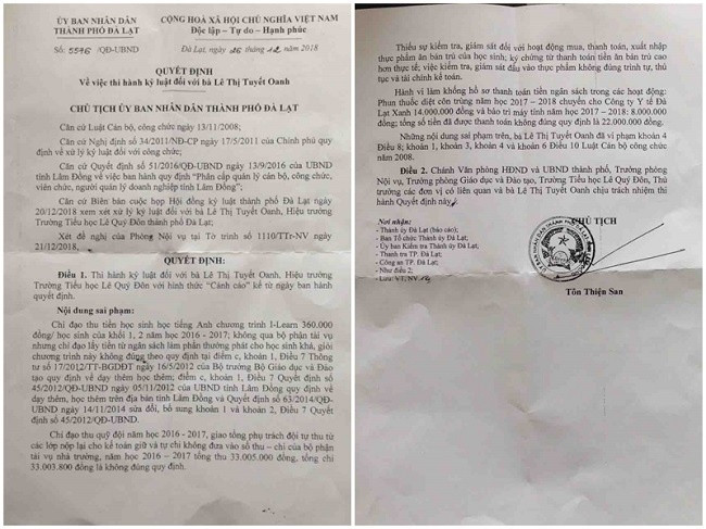 Quyết định kỷ luật cảnh cáo của UBND TP Đà Lạt đối với Hiệu trưởng Oanh