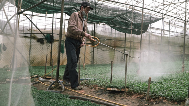 Phun thuốc cho cây trong nhà kính. Ảnh: Thanh Tâm