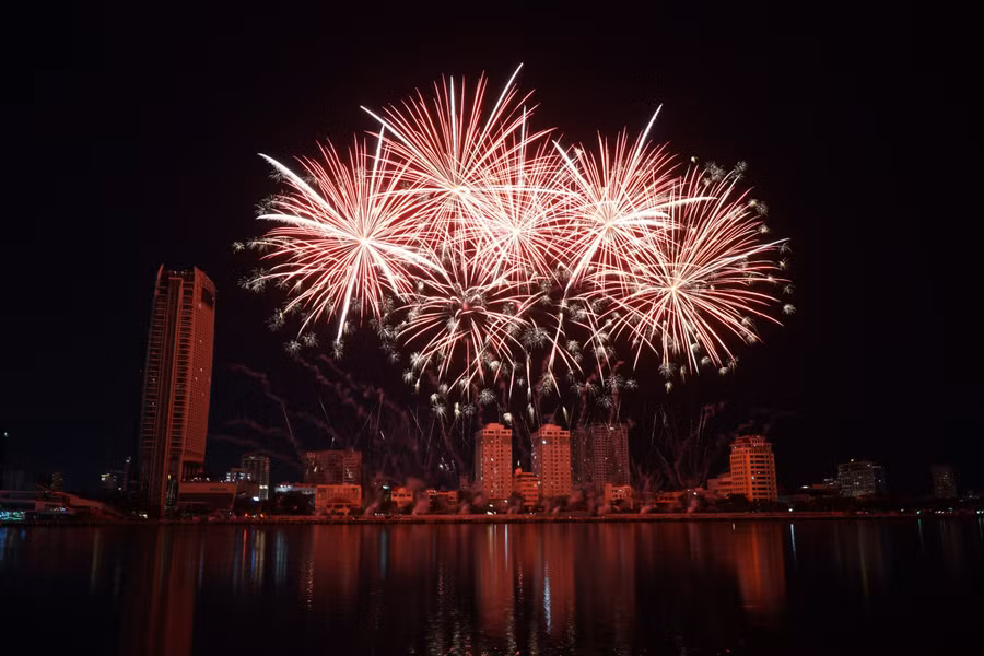 | Không gian bên sông Hàn bừng sáng, không khí tại khán đài liên tục được đẩy lên cao trào với từng đợt pháo hoa tầm cao trên nền nhạc EDM sôi động |