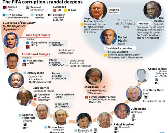 Vụ bê bối hối lộ trên lên đến 200 triệu USD đã dẫn đến việc bắt giữ hàng chục quan chức, giám đốc điều hành bóng đá - đa phần là người Mỹ Latinh - và đỉnh điểm là dẫn đến việc Chủ tịch FIFA Sepp Blatter từ chức năm 2015. Chính phủ Mỹ đã cáo buộc khoảng 45 người và một số công ty thể thao đã làm sai. Tổng cộng 26 người đã nhận tội, và ít nhất 6 người đã bị kết án.