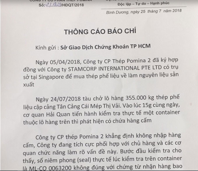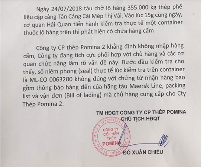Theo báo cáo giải trình, CTCP thép Pomina 2 khẳng định không nhập hàng cấm và công ty đang tích cực phối hợp với chủ hàng và các cơ quan chức năng làm rõ vấn đề này. Bước đầu kiểm tra cho thấy niêm phong (seal) thực tế lúc kiểm tra trên container là ML- CO 0063200 không đúng với chứng từ nhận hàng bao gồm thông báo hàng đến của hãng tàu Maersk Line, packing list và vận đơn (Bill of lading) mà chủ hàng cung cấp cho Công ty thép Pomina 2.