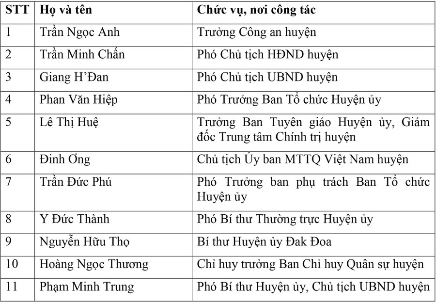 Danh sách 11 đồng chí trong Ban Thường vụ Huyện ủy Đak Đoa khóa XVII, nhiệm kỳ 2020-2025: