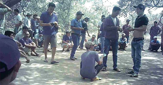 | “Đốt” tiền trong sới đá gà Ngoài sới bạc khủng nằm trong rừng, những ngày xâm nhập vào giới cờ bạc ở H.Xuyên Mộc, nhóm PV Thanh Niên còn “mục sở thị” rất nhiều trường gà lớn lôi kéo hàng trăm con bạc tham gia sát phạt. Điển hình là trường gà ở xã Phước Tân, nằm cách đường DT328 khoảng 2 km. Trường gà này trong vườn điều, đường vào ngoằn ngoèo, ô tô phải dừng ngoài đường lớn, sau đó được người dẫn đường đưa vào. Chung chi tại một trường gà mà PV Thanh Niên xâm nhập Thời điểm PV có mặt, trường gà này đang có hơn 40 con bạc say sưa sát phạt với số tiền từ 50 - 70 triệu đồng, tiếng hò hét huyên náo cả một vùng. Tuy nhiên, đây chỉ là trường gà “hạng lông” so với một trường gà cách đó chừng 1 km. Khi PV tới trường gà này phát hiện hàng loạt ô tô của con bạc đậu nép bên vệ đường. Trường gà lúc này chỉ còn tổ chức cho cặp chiến kê cuối cùng và tiền con bạc đặt cược vào lên tới cả trăm triệu đồng. Tuy nhiên, số tiền này bị “đốt” trong chỉ vài giây, khi một trong hai gà chiến vừa thả ra đã bị đối thủ tung cước khiến lật ngửa lên trời, giãy đành đạch. Cả trường gà nhanh chóng rã đám, từng đoàn ô tô nổ máy rời khỏi con đường đất, trả lại sự bình yên cho bãi đất trống. Trao đổi với PV Thanh Niên, một lãnh đạo Công an H.Xuyên Mộc nhìn nhận tình hình đánh bạc, đá gà ở địa phương diễn biến khá phức tạp. Mới đây, tại xã Phước Thuận, một nhóm thanh niên tổ chức đá gà ăn tiền rồi xảy ra mâu thuẫn, dẫn đến nổ súng (chỉ thiên). Qua điều tra, Công an H.Xuyên Mộc phối hợp cùng PC02 triệu tập những người liên quan lên làm việc. Qua đó, công an xác định người nổ súng tên Vũ “ca” và đã thu giữ một khẩu súng bắn đạn pháo. |