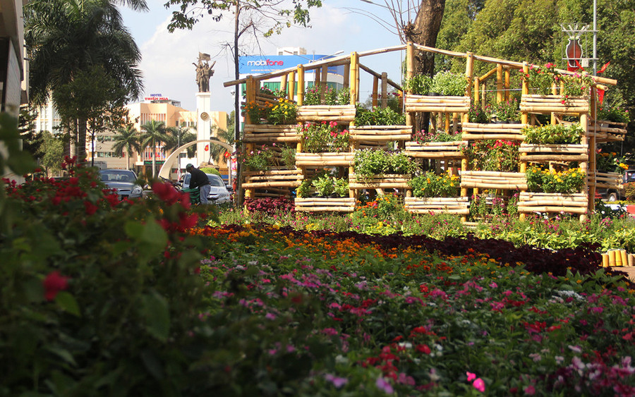 Đường hoa được thi công trên đường Nguyễn Tất Thành (TP Buôn Ma Thuột) từ nguồn thu cho thuê mặt bằng, vỉa hè bán chợ hoa Tết Mậu Tuất và một phần từ xã hội hóa.
