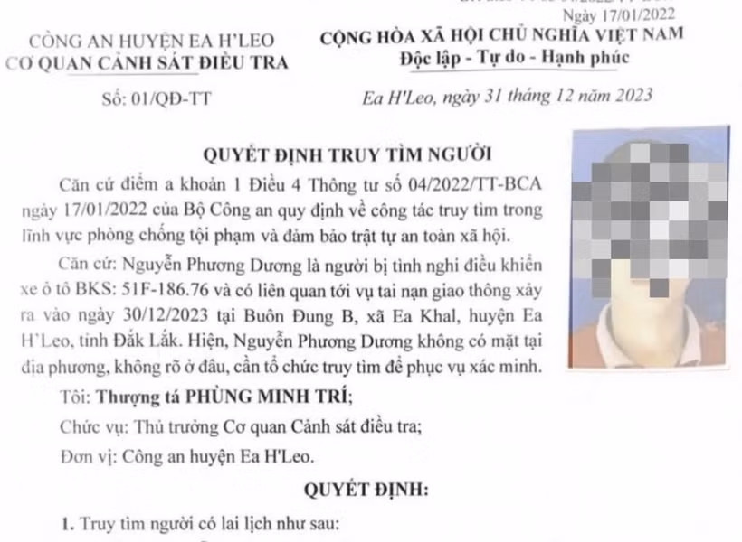 Ngày 31/12, Công an huyện Ea H’Leo, tỉnh Đắk Lắk cho biết vừa ban hành thông báo về việc truy tìm đối tượng có liên quan tới vụ tai nạn giao thông xảy ra ngày 30/12 tại buôn Đung B, xã Ea Khal, huyện Ea H’Leo khiến ba người thương vong.