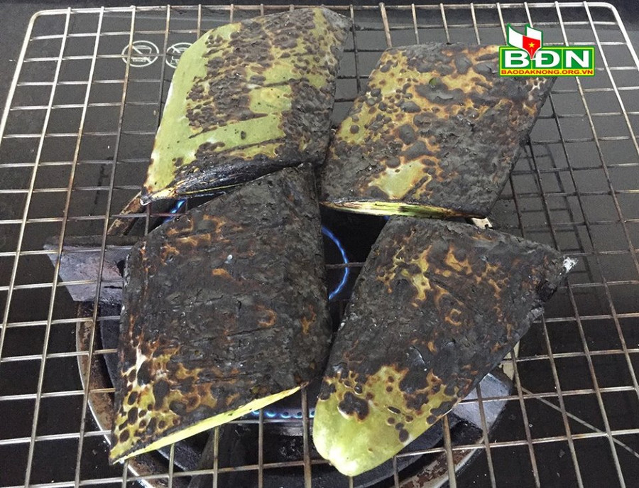Quả núc nác non được nướng chín lớp vỏ ngoài trước khi chế biến