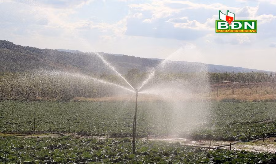Trong bối cảnh giá cả sản phẩm cây công nghiệp dài ngày liên tục sụt giảm, người nông dân đã chuyển hướng sang phát triển cây ngắn ngày để cải thiện thu nhập. Ruộng bắp cải được lắp đặt hệ thống tưới tự động.