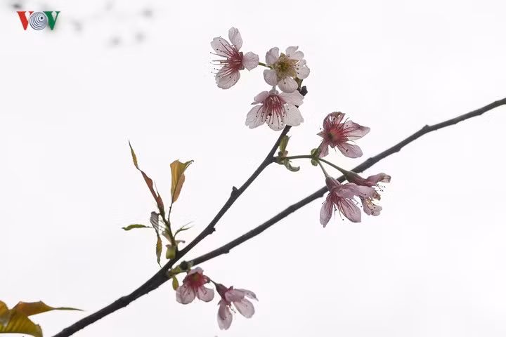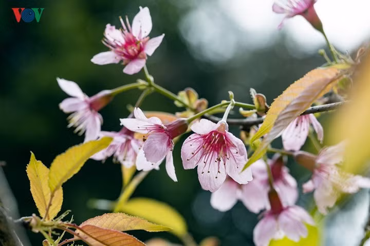 Không giống với những hình ảnh nở rực cả cây chỉ có một màu của hoa, anh đào nơi đây nở thành chùm với cả lộc non và lá xanh, cánh màu hồng phấn.