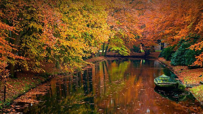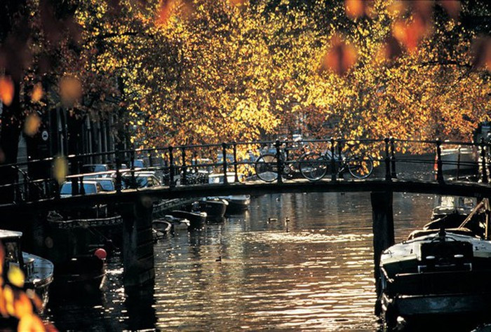 Được mệnh danh là "Venice của Hà Lan", thủ đô Amsterdam trở nên lung linh và huyền ảo hơn khi thu về. Bầu trời, hàng cây soi bóng xuống con kênh khiến cả không gian trở nên ấm áp. Ảnh: Shutterstock.