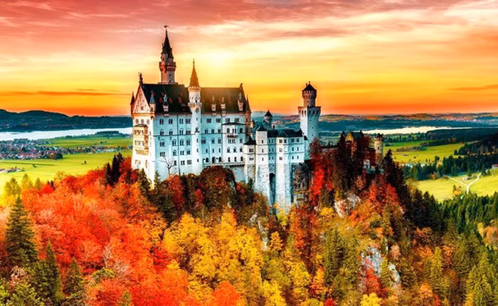 Mùa thu tại miền nam nước Đức là sự phối hợp hài hòa giữa sắc màu rực rỡ của lá phong trên nền xanh thẳm của những ngọn núi cao chót vót. Đừng quên ghé thăm lâu đài Neuschwanstein và chiêm ngưỡng vẻ tráng lệ bao phủ giữa rừng cây chuyển sang sắc vàng và đỏ. Ảnh: Shutterstock.