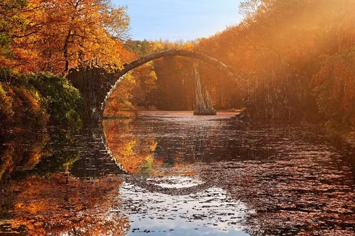 Rakotzbrucke ở Đức, hay còn gọi là Cầu Quỷ, mang phong cách La Mã cổ khoe vẻ ma mị khi tiết trời sang thu. Được xây dựng từ những năm 1860 bằng đá bazan, cầu hình vòm cùng với hình ảnh phản chiếu trên hồ tạo thành một vòng tròn gần như hoàn hảo dù nhìn ở bất cứ góc độ nào. Ảnh: Depositphotos.