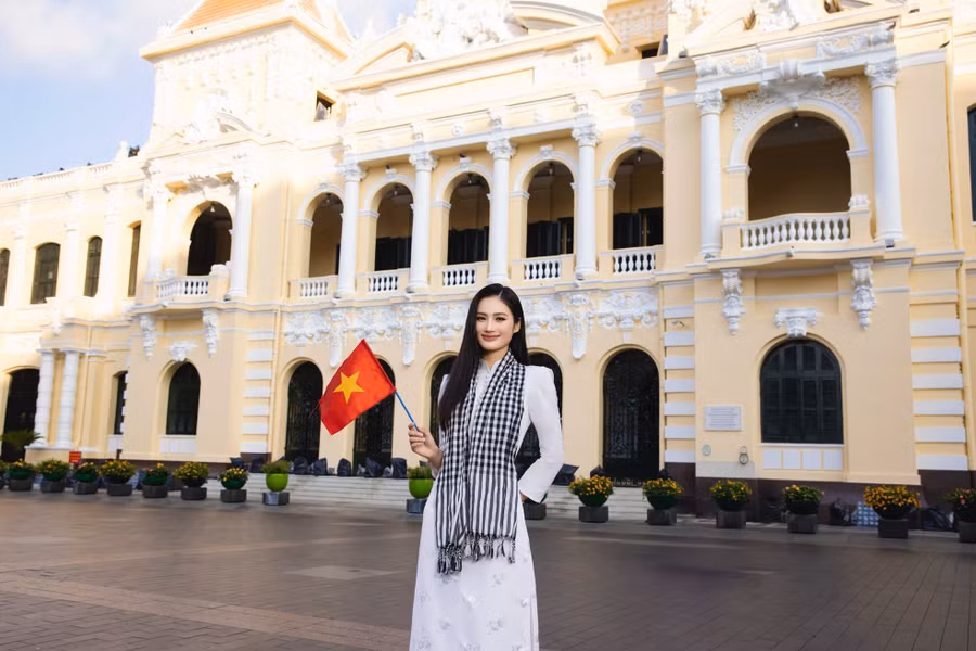 Dàn hoa, á hậu diện trang phục áo dài truyền thống, chụp ảnh tại nhiều địa danh lịch sử nổi tiếng trước thềm lễ kỷ niệm 50 năm giải phóng miền Nam, thống nhất đất nước.