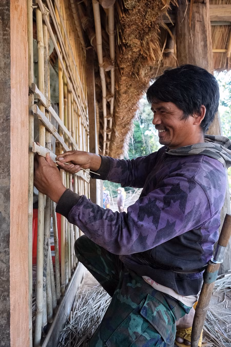 Già làng Ngưm cho biết, làng phân chia thành 5 tổ, mỗi tổ có đủ nam, nữ, già, trẻ. Các tổ sẽ được phân công công việc cụ thể như lợp mái, đan vách bằng tre nứa, cột dây mây.