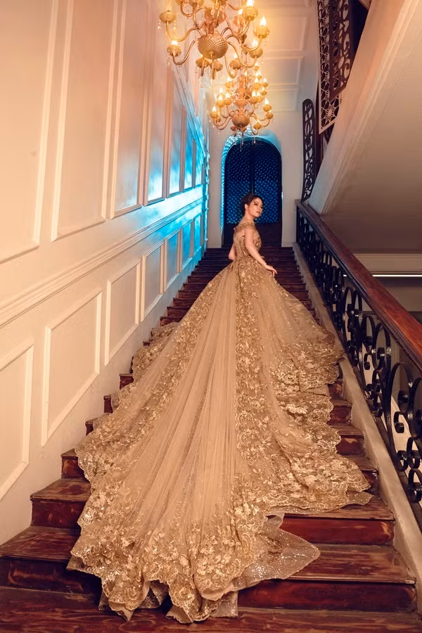 Bộ váy màu ánh kim có đuôi váy dài quét sàn giúp các cô dâu thêm nổi bật trong ngày vui.