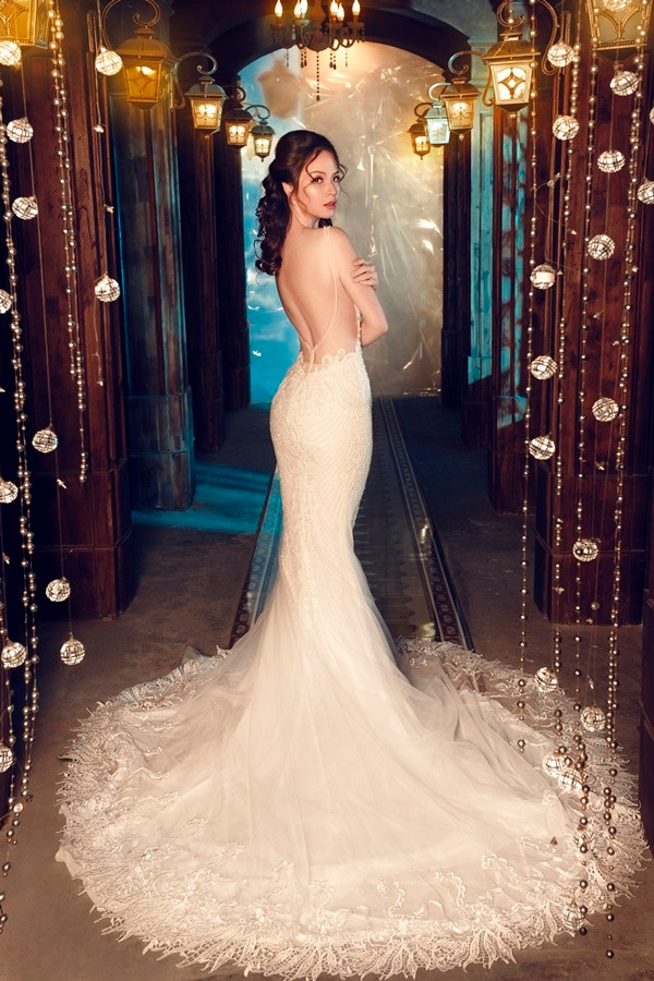 Nữ diễn viên khoe lưng trần với đầm đuôi cá. Phần gấu váy được thêu ren, tạo điểm nhấn cho thiết kế.