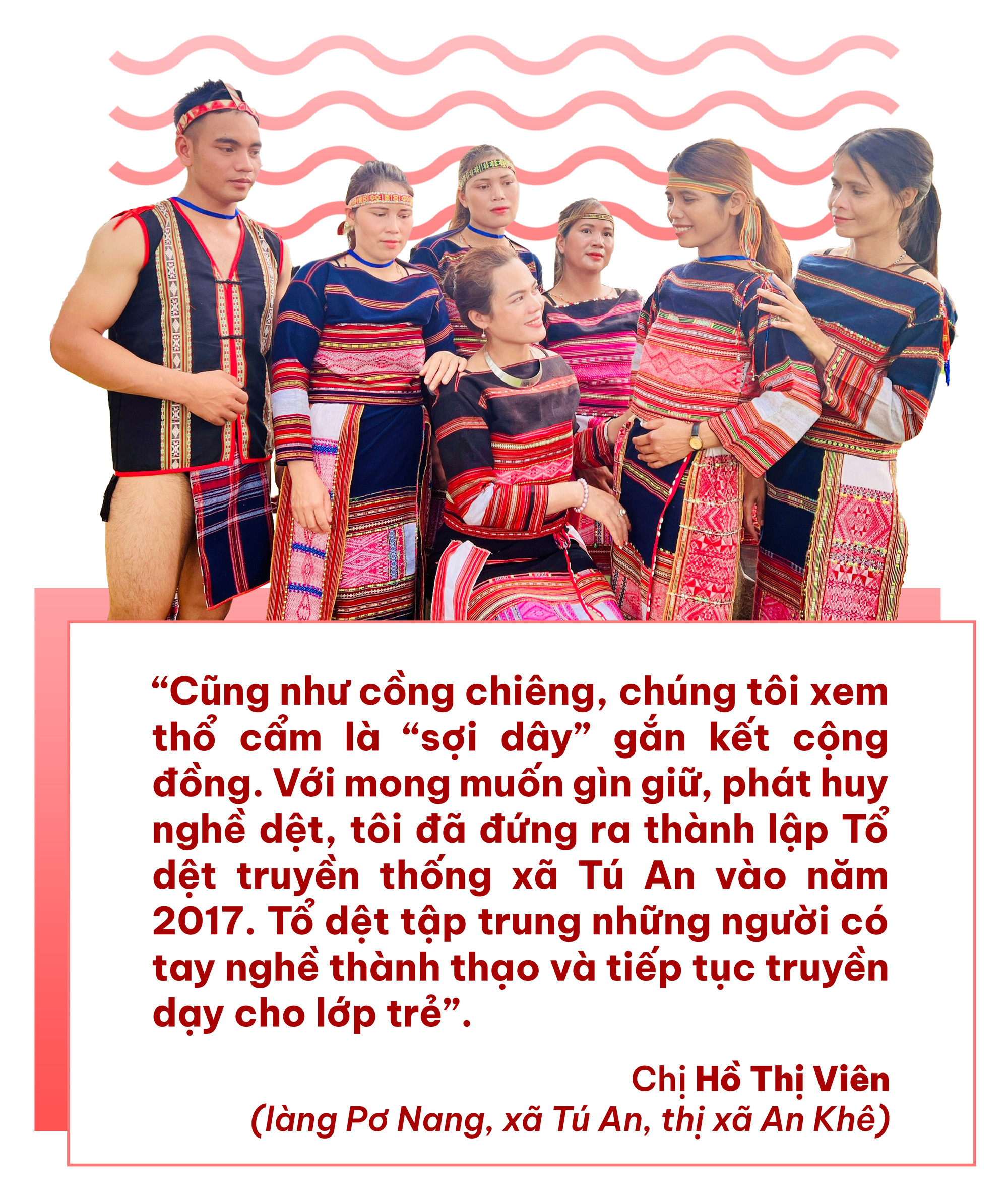 Những năm qua, chính quyền xã Tú An (thị xã An Khê) dành nhiều sự quan tâm cho Tổ dệt truyền thống của xã do đảng viên trẻ Hồ Thị Viên (SN 1991, làng Pơ Nang) thành lập. Chị là hạt nhân nòng cốt liên kết, hướng dẫn, truyền dạy và cùng mọi người dệt thổ cẩm. “Với sự hỗ trợ của địa phương, chúng tôi phấn đấu đưa thổ cẩm xã Tú An thành sản phẩm OCOP để mở rộng thị trường tiêu thụ, tăng thêm thu nhập cho bà con. Đây cũng là động lực góp phần gìn giữ, phát huy bản sắc văn hóa dân tộc”-chị Viên cho biết.