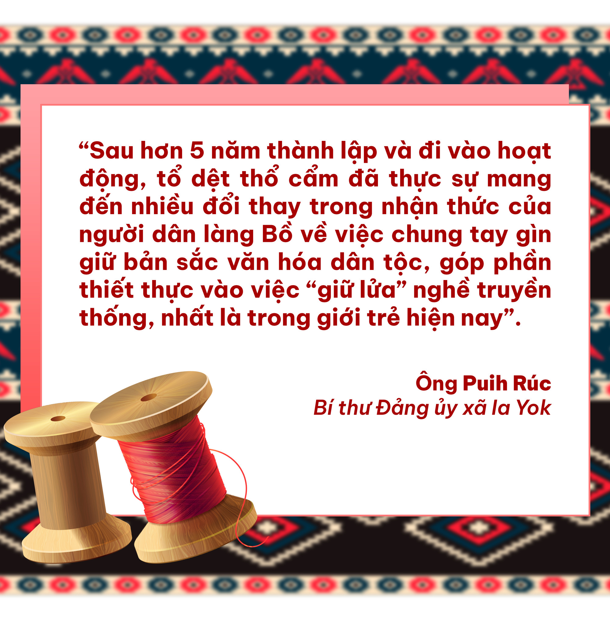 Tham gia tổ dệt thổ cẩm, chị Rơ Châm Hyan cho hay: “Thay vì mỗi người tự dệt, tự tiêu thụ sản phẩm như trước đây, chúng tôi đã tập hợp lại thành tổ dệt. Dưới sự quan tâm giúp đỡ của chị H’Panh, tổ dệt đã thực sự trở thành nơi sinh hoạt đầy bổ ích cho phụ nữ trong làng. Có sự tập hợp, đoàn kết nên việc xây dựng thương hiệu cũng như tìm đầu ra cho sản phẩm thổ cẩm của chị em được dễ dàng và thuận lợi hơn”. Đến nay, tổ dệt thổ cẩm làng Bồ có 12 thành viên. Để sản phẩm dễ dàng tiêu thụ trên thị trường, các chị em nỗ lực sáng tạo ra nhiều mẫu dệt, hoa văn mới. Với vai trò là Tổ trưởng, chị H’Panh đã tích cực quảng bá sản phẩm dệt trên mạng xã hội Facebook, Zalo… để dễ dàng tiếp cận khách hàng gần xa.
