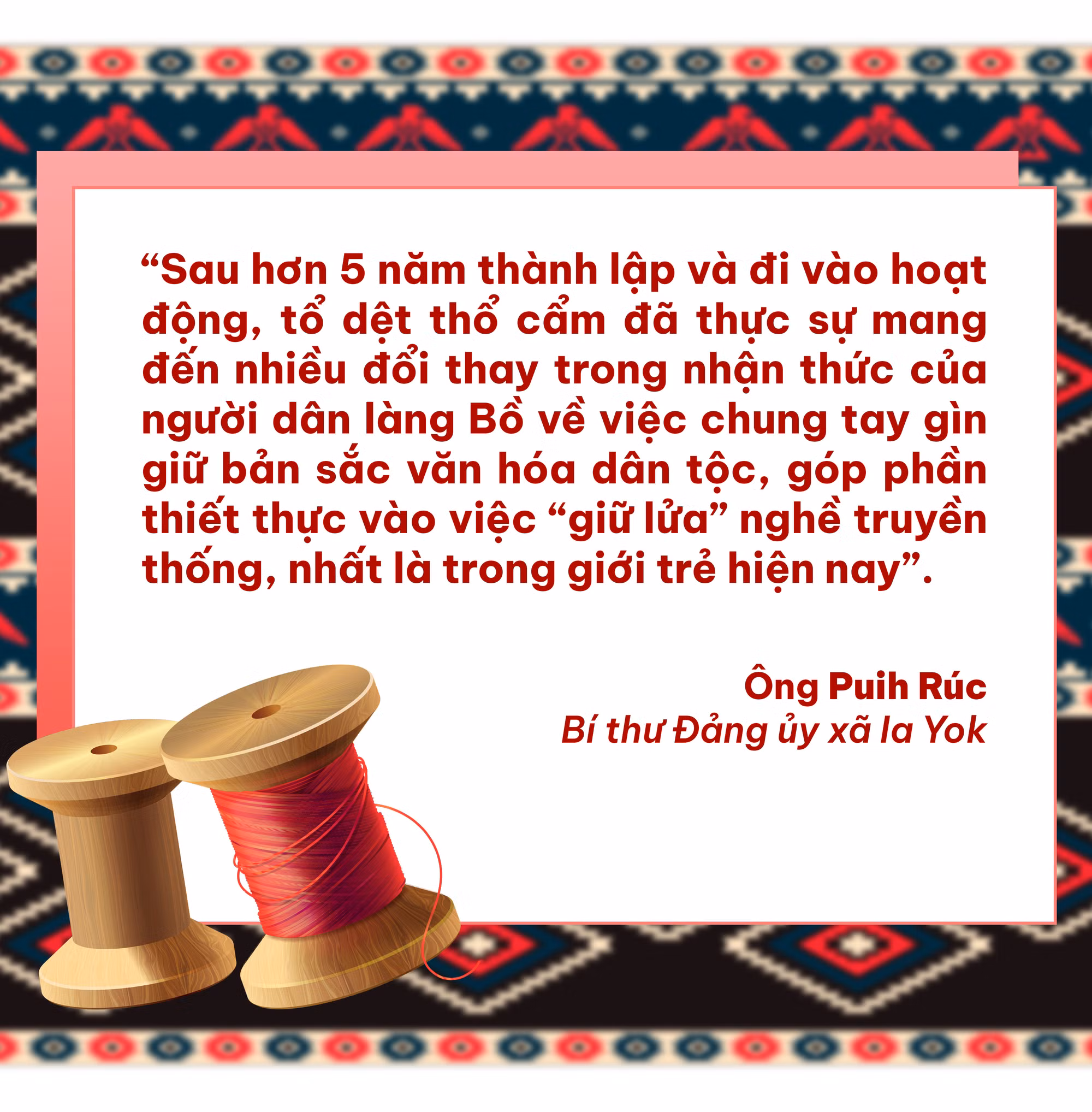 Ông Puih Rúc-Bí thư Đảng ủy xã Ia Yok-cho biết: “Chị Rơ Châm H’Panh là đảng viên trẻ có nhiều cách làm mới mẻ, sáng tạo khi đứng ra thành lập tổ dệt thổ cẩm làng Bồ. Là thành viên nhỏ tuổi nhất và cũng nhiều tâm huyết nhất, chị H’Panh là “cầu nối” giữa tổ dệt với các cấp, ngành. Để từ đó, nhiều cơ hội quảng bá, giới thiệu và tiêu thụ sản phẩm cũng được mở ra.