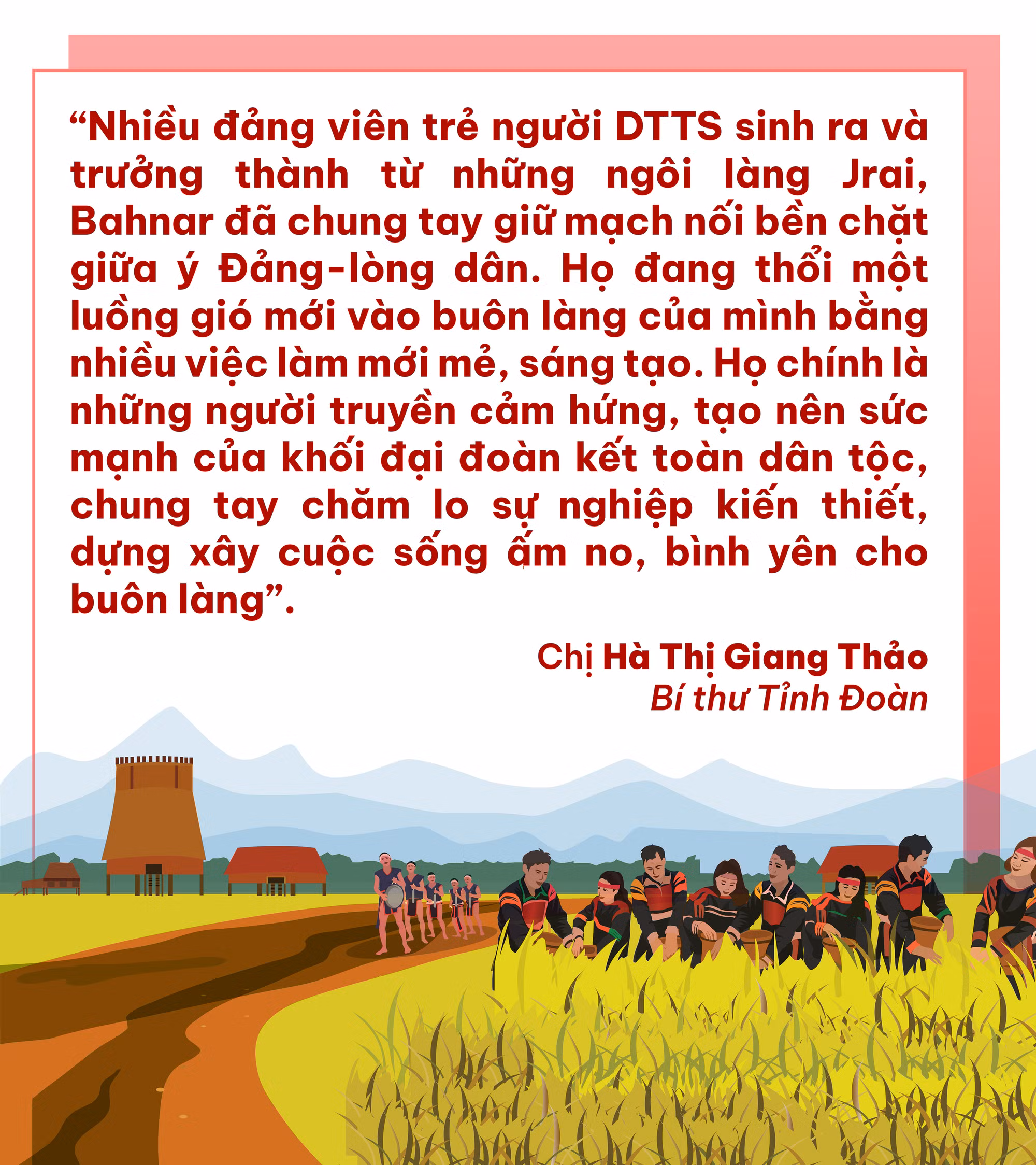 Theo đánh giá của Tỉnh Đoàn, hầu hết đảng viên trẻ người DTTS trưởng thành từ những ngôi làng trên địa bàn tỉnh đã phát huy được vai trò trong phát triển kinh tế-xã hội, gìn giữ bản sắc văn hóa dân tộc. Toàn tỉnh hiện có hơn 500 ngàn thanh niên, trong đó, thanh niên người DTTS chiếm trên 52%. Để tạo “hạt nhân” trong các phong trào thi đua, các tổ chức cơ sở Đoàn đã có nhiều giải pháp nhân rộng điển hình và giới thiệu thanh niên ưu tú người DTTS cho Đảng xem xét kết nạp. Cùng với đó, để khơi dậy tinh thần khởi nghiệp trong đảng viên trẻ người DTTS, Tỉnh Đoàn, Hội Liên hiệp thanh niên Việt Nam tỉnh đã triển khai nhiều hoạt động trong phong trào “Đồng hành cùng thanh niên khởi nghiệp, lập nghiệp”. Hàng năm, các hoạt động tập huấn, diễn đàn, tuyên dương gương thanh niên khởi nghiệp, lập nghiệp tiêu biểu được Đoàn-Hội các cấp quan tâm tổ chức để tạo cảm hứng, cổ vũ thanh niên DTTS tự tin khởi nghiệp. Nhiều chương trình hỗ trợ thông tin, kiến thức, kỹ năng khởi nghiệp được Tỉnh Đoàn, Hội Liên hiệp thanh niên Việt Nam tỉnh tổ chức thường xuyên và hướng về cơ sở. Bên cạnh đó, những mô hình, gương điển hình phát triển kinh tế, bảo tồn, phát huy giá trị văn hóa truyền thống cũng được tổ chức Đoàn-Hội các cấp đẩy mạnh giới thiệu, tuyên truyền, đăng tải thường xuyên trên mạng xã hội Facebook, Zalo để thanh niên theo dõi, chia sẻ, học tập và lan tỏa trong cộng đồng.