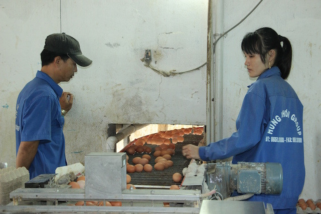 Công nhân đang làm việc tại trại nuôi gà của Tập đoàn Hùng Nhơn (Bình Phước). Ảnh: Thanh Liêm