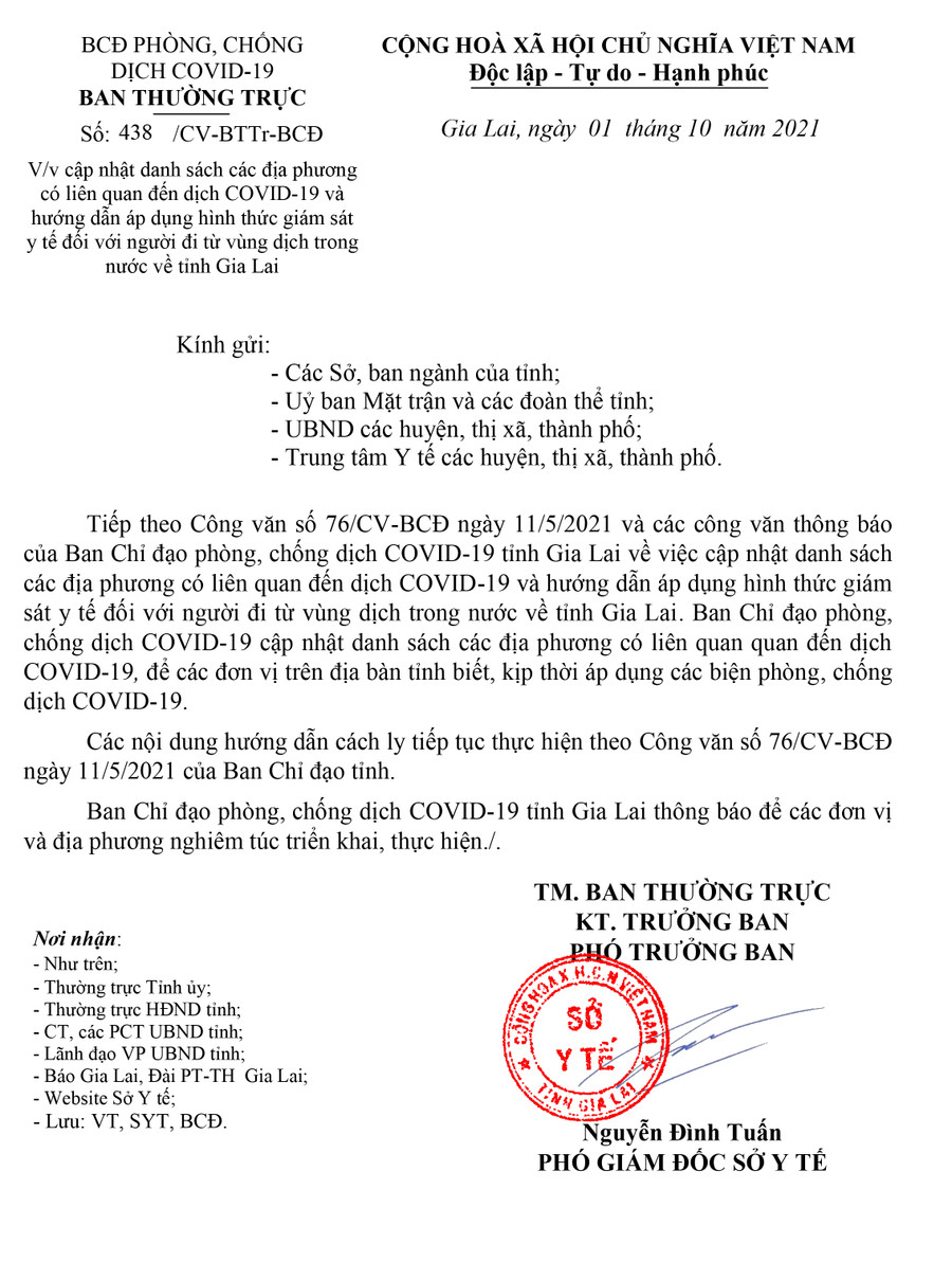(GLO)- Ngày 1-10, Ban Chỉ đạo phòng-chống dịch Covid-19 tỉnh Gia Lai có Công văn số 438/CV-BTTr-BCĐ về cập nhật danh sách các địa phương có liên quan đến dịch Covid-19 và hướng dẫn áp dụng hình thức giám sát y tế đối với người đi từ vùng dịch trong nước về tỉnh.