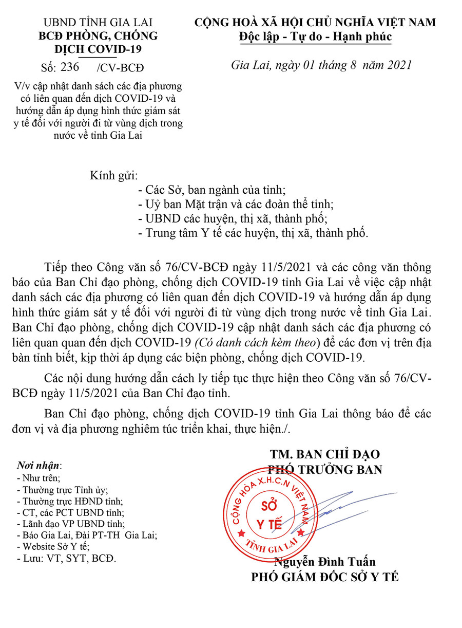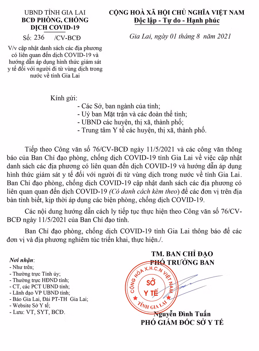 (GLO)- Ngày 1-8, Ban Chỉ đạo phòng-chống dịch Covid-19 tỉnh Gia Lai có Công văn số 236/CV-BCĐ về cập nhật danh sách các địa phương có liên quan đến dịch Covid-19 và hướng dẫn áp dụng hình thức giám sát y tế đối với người đi từ vùng dịch trong nước về tỉnh.
