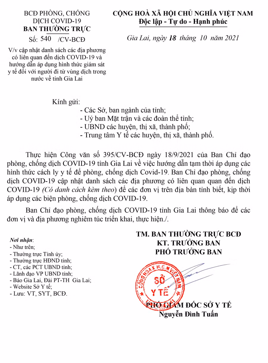 (GLO)- Ngày 18-10, Ban Chỉ đạo phòng-chống dịch Covid-19 tỉnh Gia Lai có Công văn số 540/CV-BCĐ về cập nhật danh sách các địa phương có liên quan đến dịch Covid-19 và hướng dẫn áp dụng hình thức giám sát y tế đối với người đi từ vùng dịch trong nước về tỉnh.
