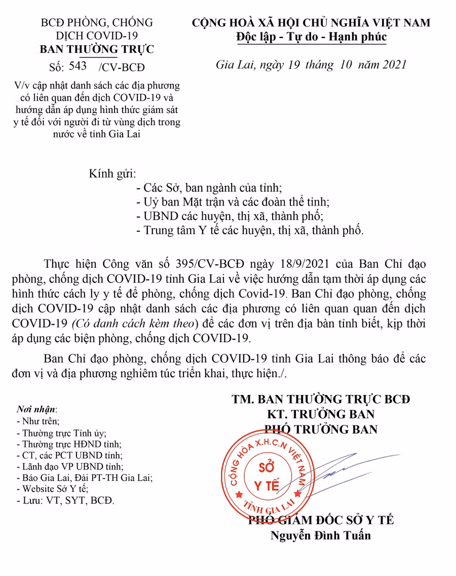 (GLO)- Ngày 19-10, Ban Chỉ đạo phòng-chống dịch Covid-19 tỉnh Gia Lai có Công văn số 543/CV-BCĐ về cập nhật danh sách các địa phương có liên quan đến dịch Covid-19 và hướng dẫn áp dụng hình thức giám sát y tế đối với người đi từ vùng dịch trong nước về tỉnh.