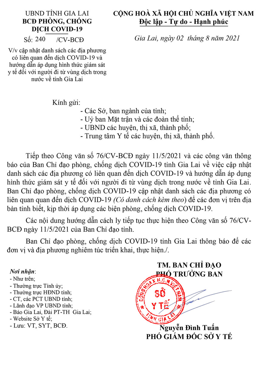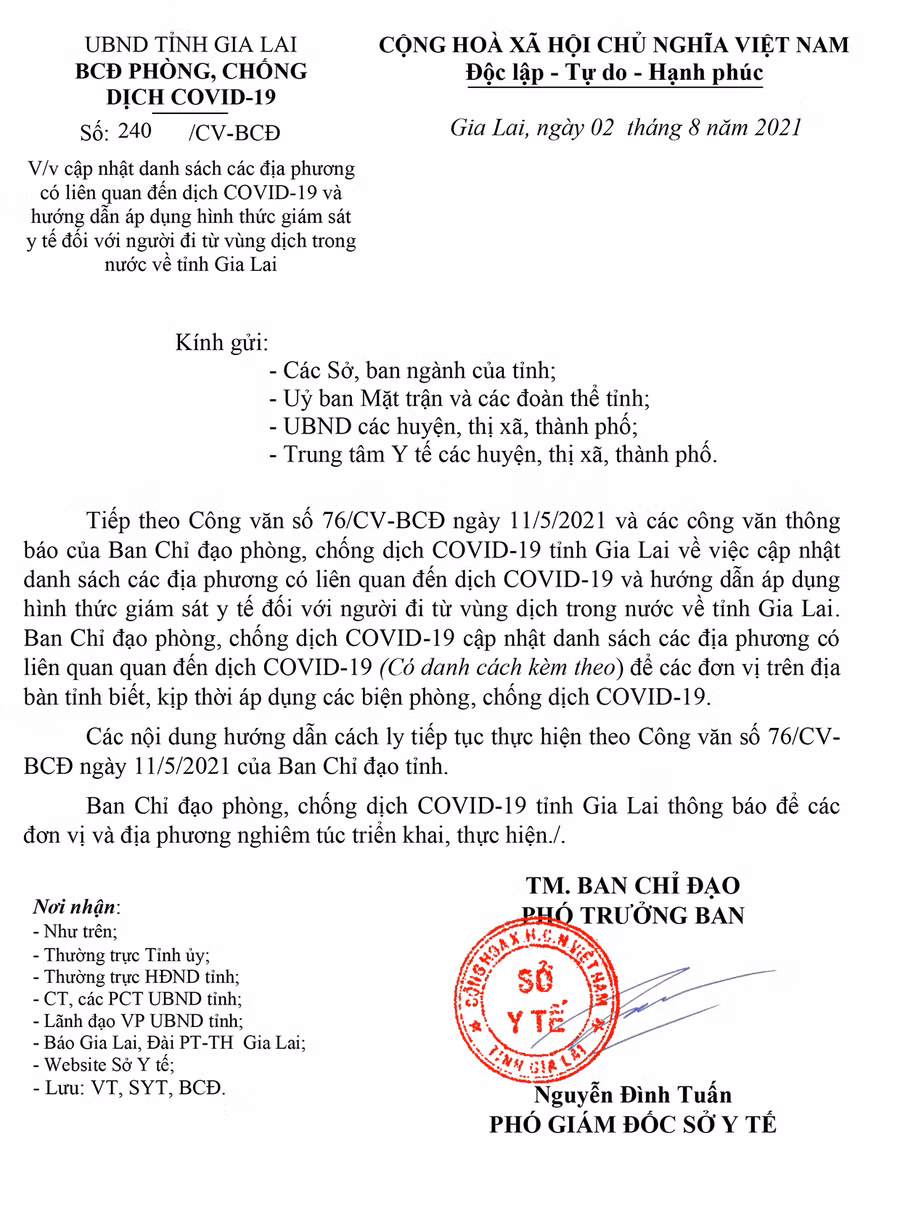 (GLO)- Ngày 2-8, Ban Chỉ đạo phòng-chống dịch Covid-19 tỉnh Gia Lai có Công văn số 240/CV-BCĐ về cập nhật danh sách các địa phương có liên quan đến dịch Covid-19 và hướng dẫn áp dụng hình thức giám sát y tế đối với người đi từ vùng dịch trong nước về tỉnh.