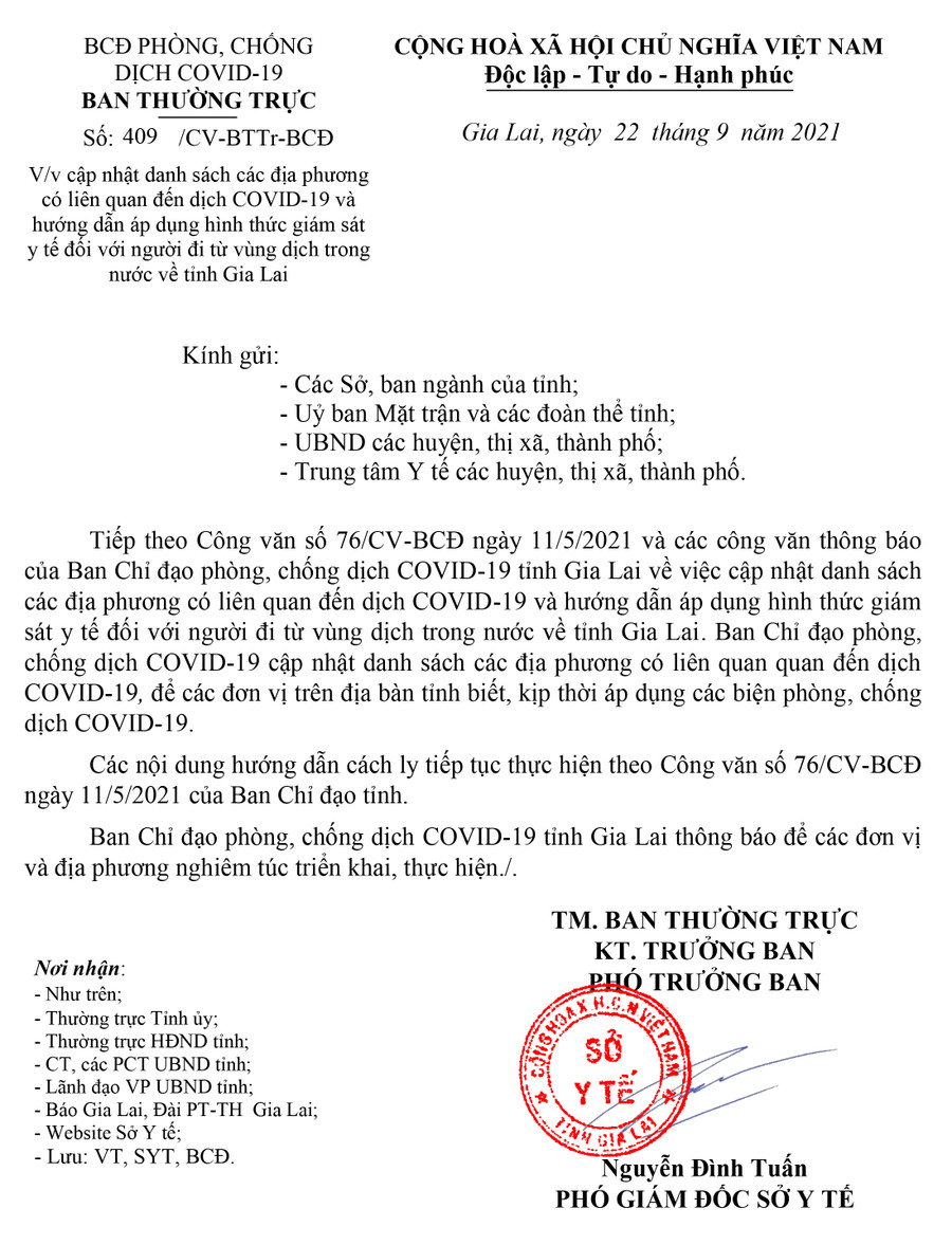 (GLO)- Ngày 22-9, Ban Chỉ đạo phòng-chống dịch Covid-19 tỉnh Gia Lai có Công văn số 409/CV-BCĐ về cập nhật danh sách các địa phương có liên quan đến dịch Covid-19 và hướng dẫn áp dụng hình thức giám sát y tế đối với người đi từ vùng dịch trong nước về tỉnh.