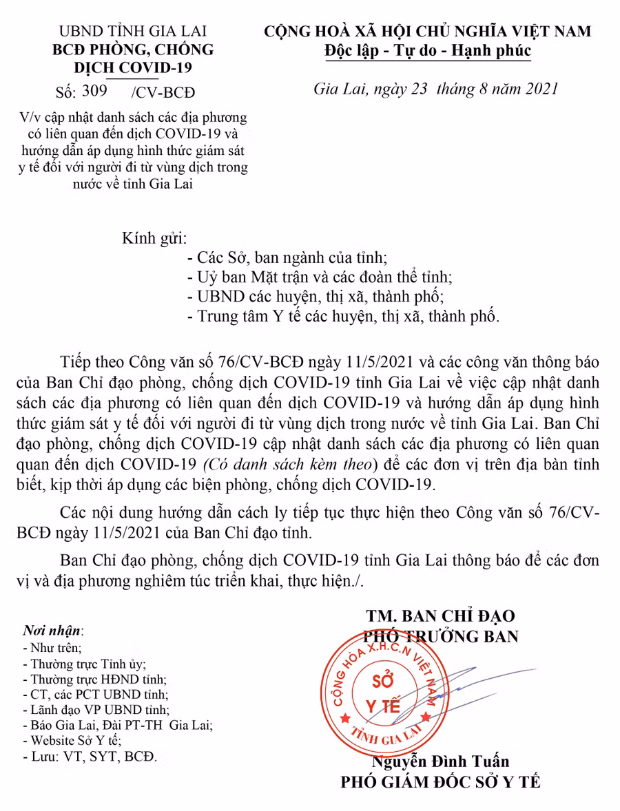 (GLO)- Ngày 23-8, Ban Chỉ đạo phòng-chống dịch Covid-19 tỉnh Gia Lai có Công văn số 309/CV-BCĐ về cập nhật danh sách các địa phương có liên quan đến dịch Covid-19 và hướng dẫn áp dụng hình thức giám sát y tế đối với người đi từ vùng dịch trong nước về tỉnh.