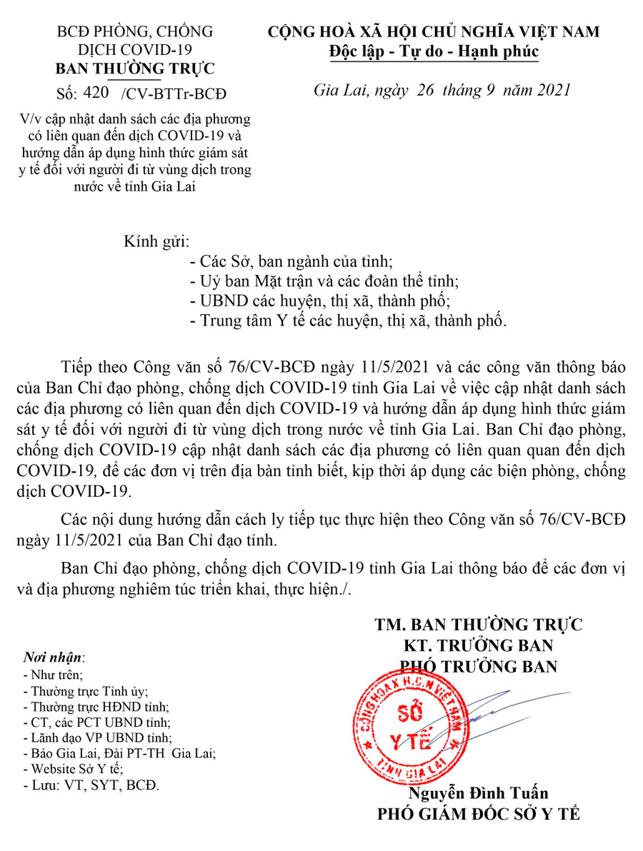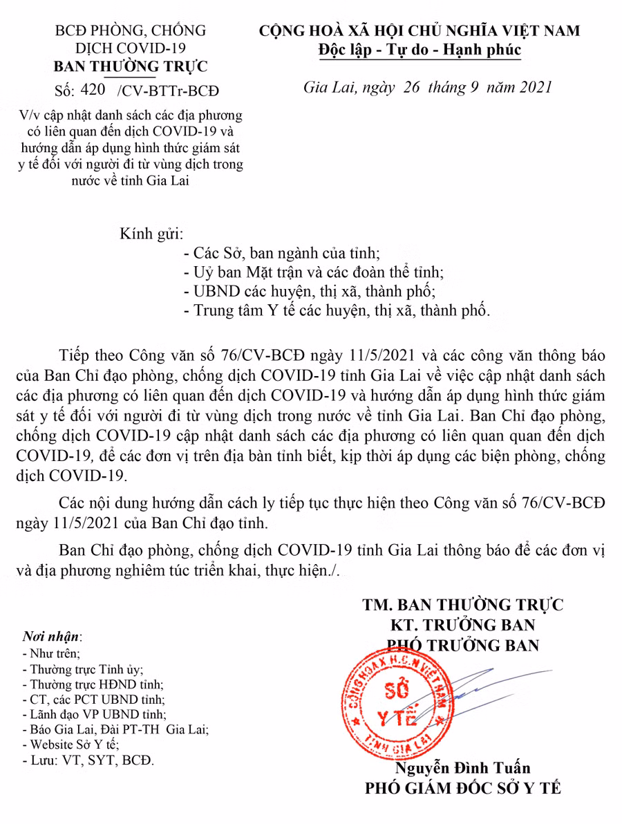 (GLO)- Ngày 26-9, Ban Chỉ đạo phòng-chống dịch Covid-19 tỉnh Gia Lai có Công văn số 420/CV-BCĐ về cập nhật danh sách các địa phương có liên quan đến dịch Covid-19 và hướng dẫn áp dụng hình thức giám sát y tế đối với người đi từ vùng dịch trong nước về tỉnh.