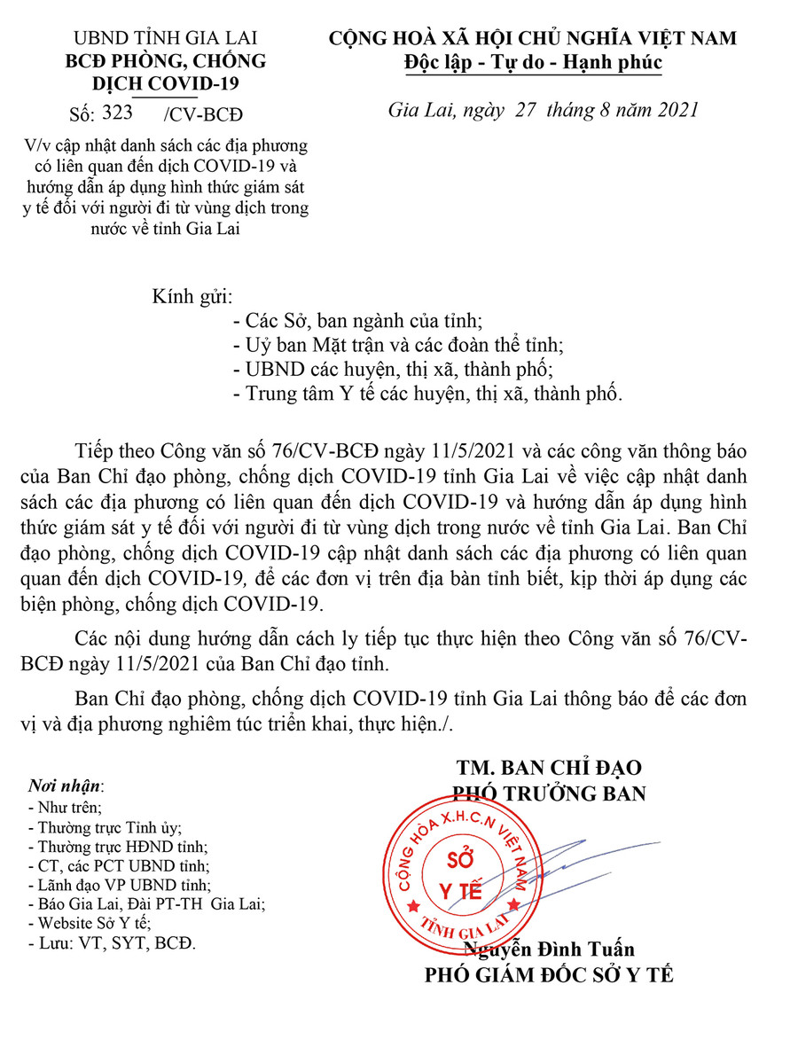 (GLO)- Ngày 27-8, Ban Chỉ đạo phòng-chống dịch Covid-19 tỉnh Gia Lai có Công văn số 323/CV-BCĐ về cập nhật danh sách các địa phương có liên quan đến dịch Covid-19 và hướng dẫn áp dụng hình thức giám sát y tế đối với người đi từ vùng dịch trong nước về tỉnh.