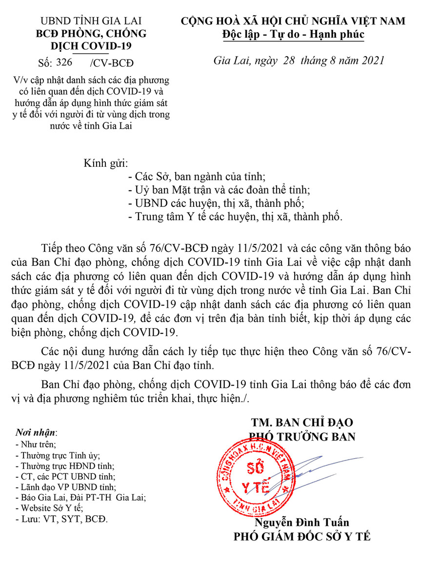 (GLO)- Ngày 28-8, Ban Chỉ đạo phòng-chống dịch Covid-19 tỉnh Gia Lai có Công văn số 326/CV-BCĐ về cập nhật danh sách các địa phương có liên quan đến dịch Covid-19 và hướng dẫn áp dụng hình thức giám sát y tế đối với người đi từ vùng dịch trong nước về tỉnh.