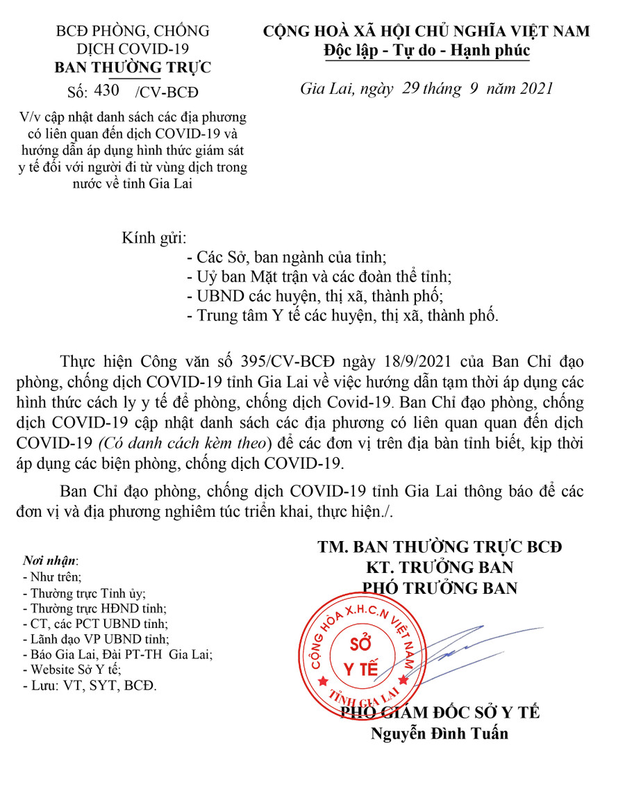 (GLO)- Ngày 29-9, Ban Chỉ đạo phòng-chống dịch Covid-19 tỉnh Gia Lai có Công văn số 430/CV-BCĐ về cập nhật danh sách các địa phương có liên quan đến dịch Covid-19 và hướng dẫn áp dụng hình thức giám sát y tế đối với người đi từ vùng dịch trong nước về tỉnh.
