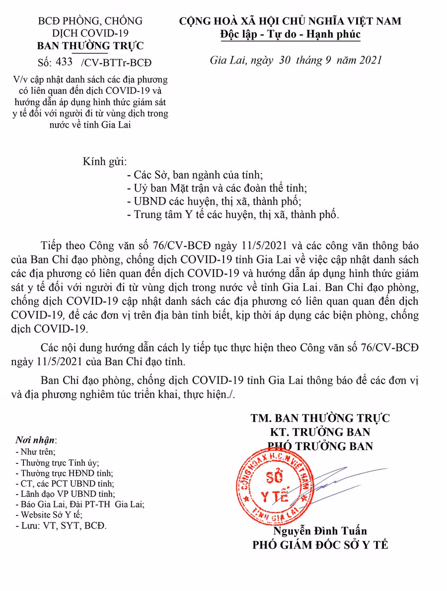 (GLO)- Ngày 30-9, Ban Chỉ đạo phòng-chống dịch Covid-19 tỉnh Gia Lai có Công văn số 433/CV-BTTr-BCĐ về cập nhật danh sách các địa phương có liên quan đến dịch Covid-19 và hướng dẫn áp dụng hình thức giám sát y tế đối với người đi từ vùng dịch trong nước về tỉnh.