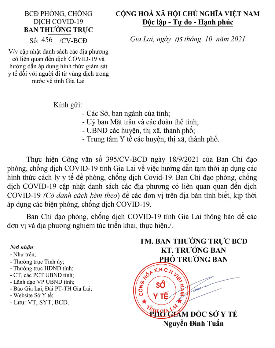 (GLO)- Ngày 5-10, Ban Chỉ đạo phòng-chống dịch Covid-19 tỉnh Gia Lai có Công văn số 456/CV-BCĐ về cập nhật danh sách các địa phương có liên quan đến dịch Covid-19 và hướng dẫn áp dụng hình thức giám sát y tế đối với người đi từ vùng dịch trong nước về tỉnh.