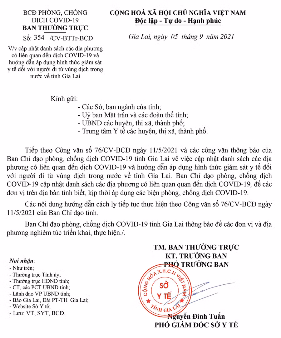 (GLO)- Ngày 5-9, Ban Chỉ đạo phòng-chống dịch Covid-19 tỉnh Gia Lai có Công văn số 354/CV-BCĐ về cập nhật danh sách các địa phương có liên quan đến dịch Covid-19 và hướng dẫn áp dụng hình thức giám sát y tế đối với người đi từ vùng dịch trong nước về tỉnh.