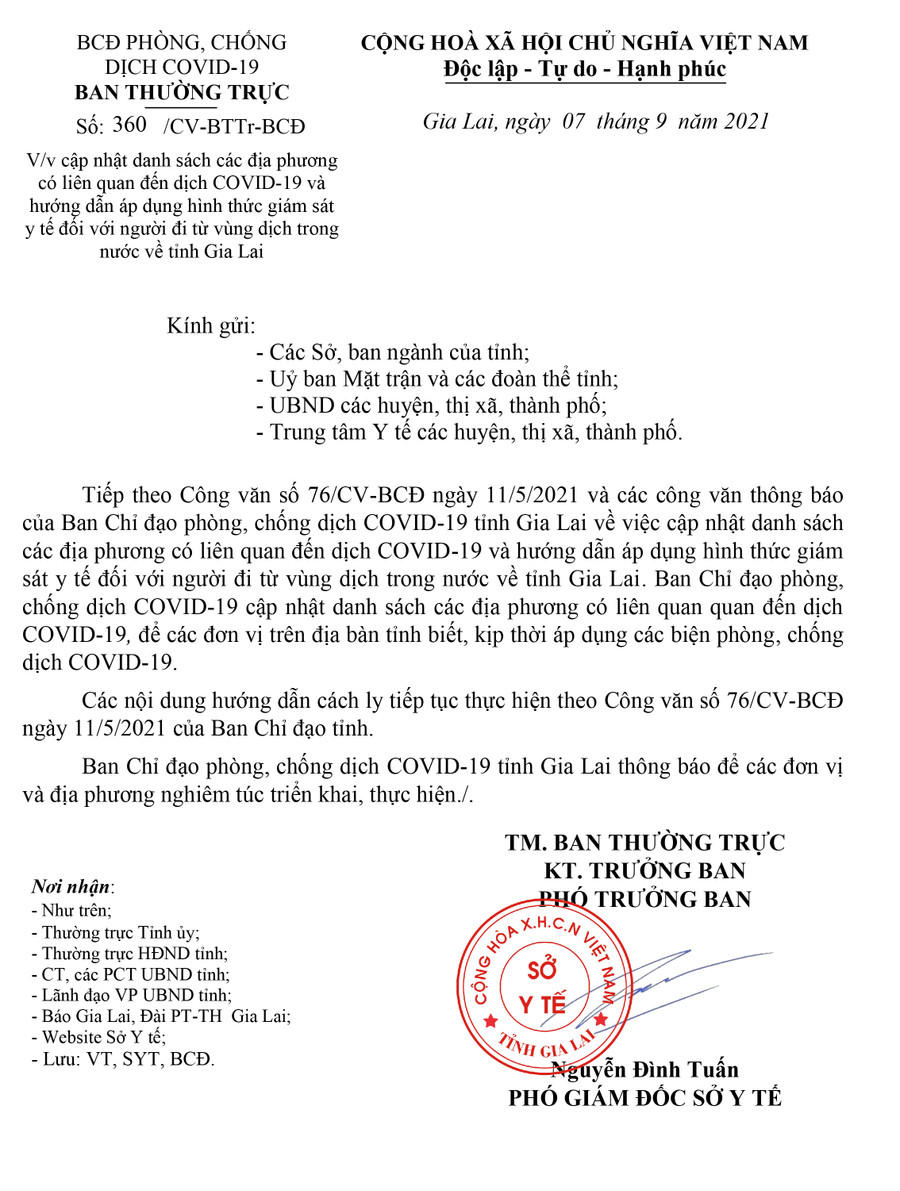 (GLO)- Ngày 7-9, Ban Chỉ đạo phòng-chống dịch Covid-19 tỉnh Gia Lai có Công văn số 360/CV-BCĐ về cập nhật danh sách các địa phương có liên quan đến dịch Covid-19 và hướng dẫn áp dụng hình thức giám sát y tế đối với người đi từ vùng dịch trong nước về tỉnh.