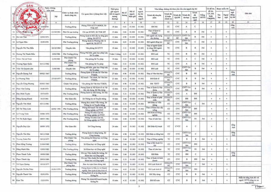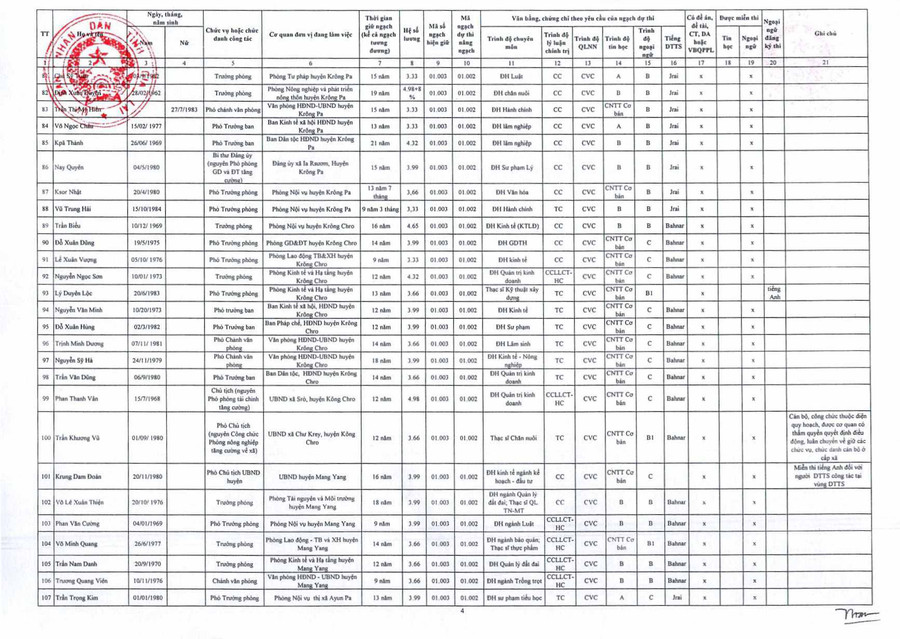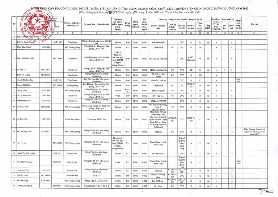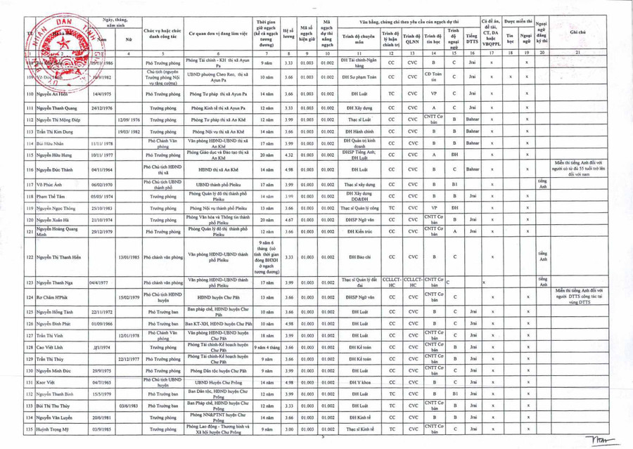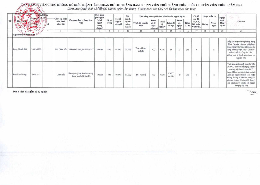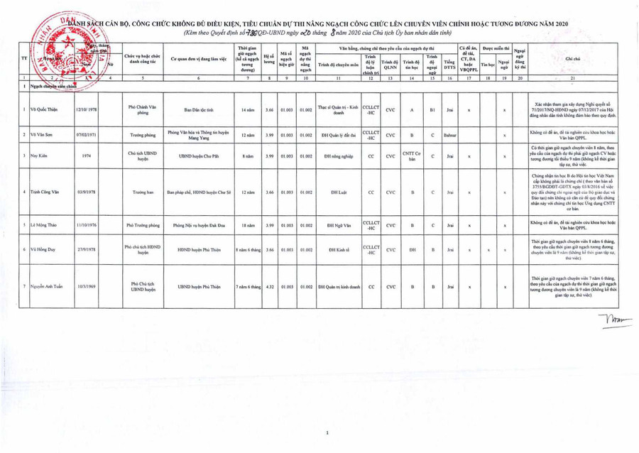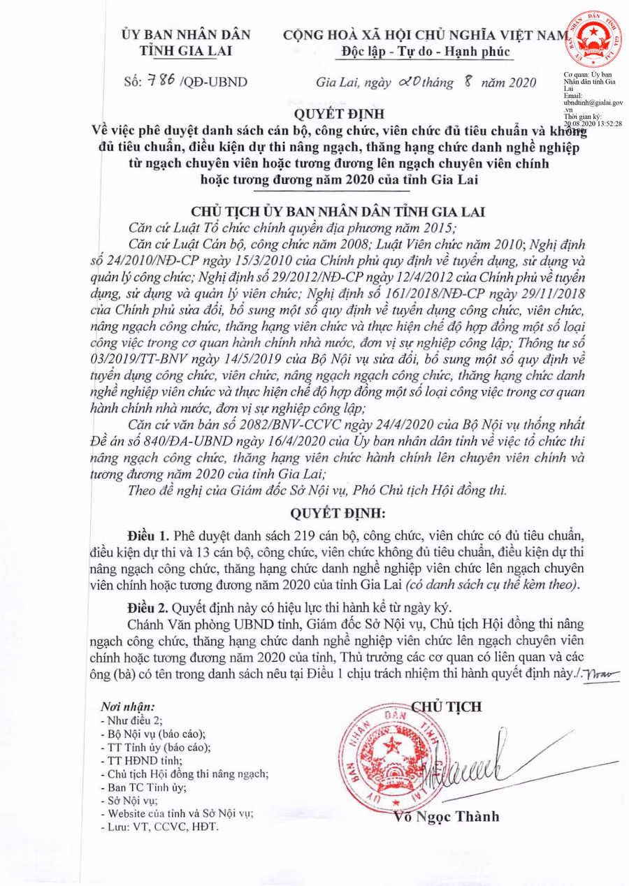 (GLO)- Ngày 20-8, UBND Gia Lai có Quyết định số 786/QĐ-UBND về việc phê duyệt danh sách cán bộ, công chức, viên chức đủ tiêu chuẩn và không đủ tiêu chuẩn, điều kiện dự thi nâng ngạch, thăng hạng chức danh nghề nghiệp từ ngạch chuyên viên hoặc tương đương lên ngạch chuyên viên chính hoặc tương đương năm 2020 của tỉnh Gia Lai.