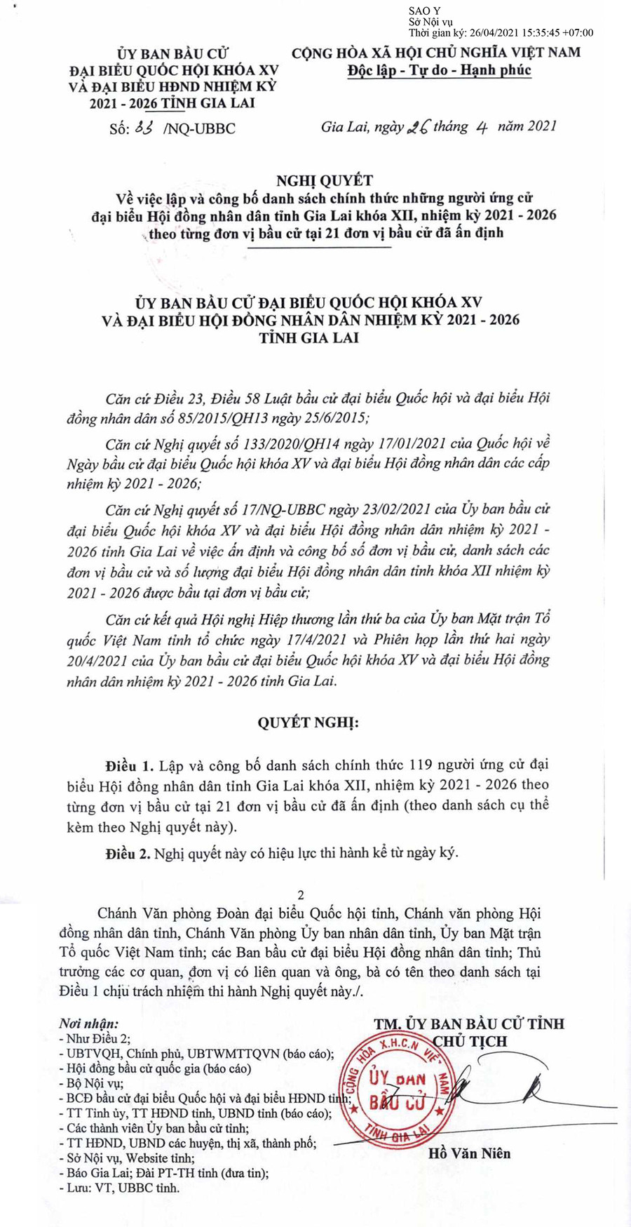 (GLO)- Ngày 26-4-2021, Ủy ban bầu cử đại biểu Quốc hội khóa XV và đại biểu HĐND nhiệm kỳ 2021-2026 tỉnh Gia Lai có Nghị quyết số 33/NQ-UBBC công bố danh sách chính thức những người ứng cử đại biểu HĐND tỉnh Gia Lai khóa XII (nhiệm kỳ 2021-2026) theo từng đơn vị bầu cử tại 21 đơn vị bầu cử đã ấn định.