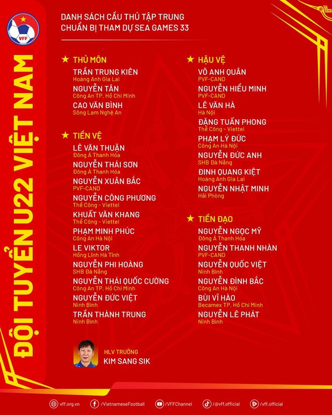 Huấn luyện viên trưởng Kim Sang-sik đã chính thức công bố danh sách 28 cầu thủ cho đợt tập trung cuối cùng chuẩn bị SEA Games 33 tổ chức tại Thái Lan.