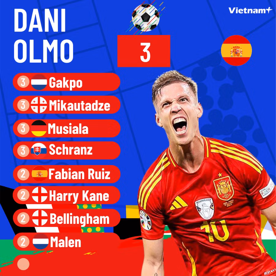 Trong số 3 người cùng ghi được 3 bàn như Olmo thì cũng chỉ có Cody Gakpo tiếp tục có cơ hội nâng cao thành tích ghi ra sân ở trận gặp Anh đêm nay, qua đó có thể trở thành đối thủ tiềm năng của Tây Ban Nha ở trận chung kết. Còn lại cả Mikautadze, Schranz và Musiala đều đã bị loại.
