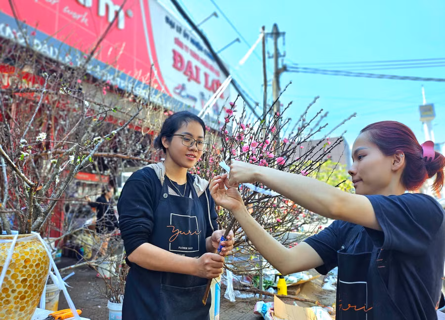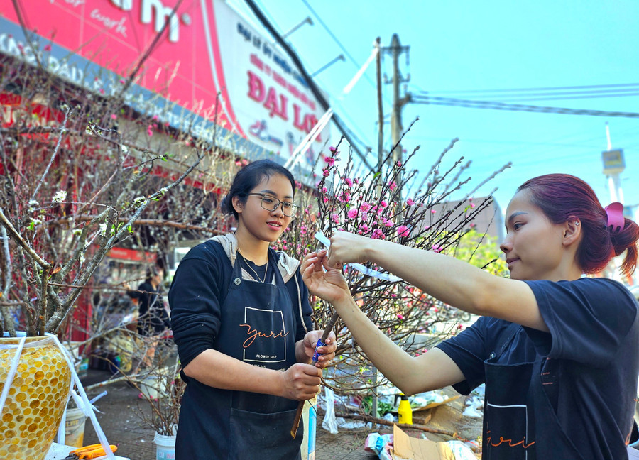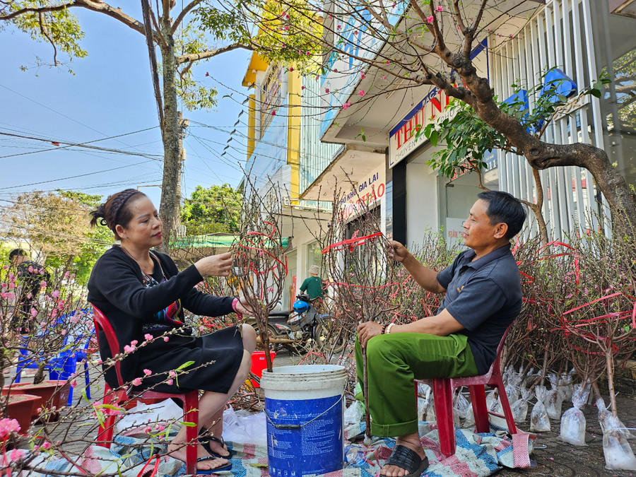 Dạo một vòng quanh các tuyến đường trung tâm của TP. Pleiku như: Trần Phú, Nguyễn Thiện Thuật, Phan Đình Phùng…, không khó để bắt gặp sắc hồng tươi thắm của những cành đào bích, đào phai Nhật Tân được bày bán cùng với những loại hoa, cây kiểng khác. Đáng chú ý, lượng khách tìm đến những cơ sở này để mua đào trở nên đông đúc hơn trong những ngày cuối cùng của năm Quý Mão.