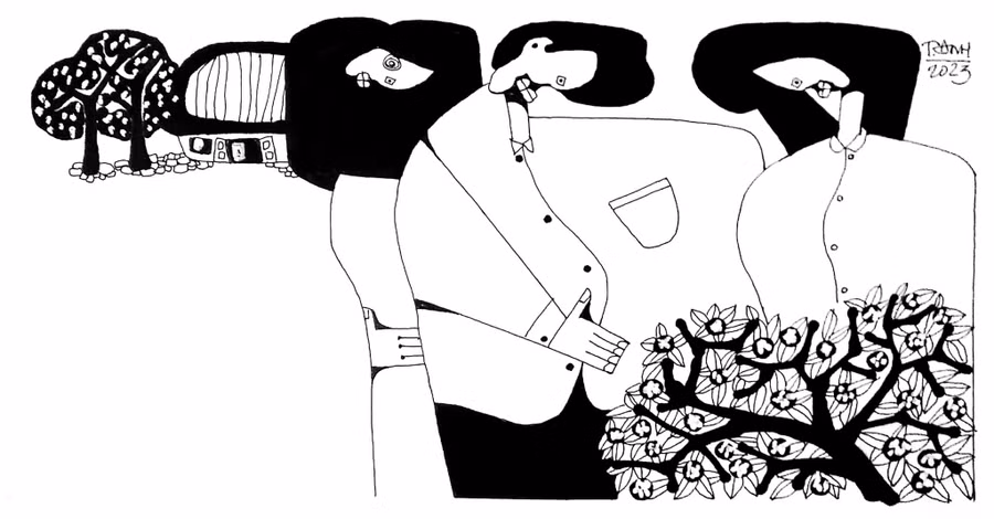 Nghĩ đến chị Tú, Thành khẽ mỉm cười. Vy kêu anh dừng xe. Hai người ngồi trên đê đưa mắt ngắm cánh đồng trải dài tít tắp. Những cành đào được uốn khéo quá, hàng trăm tay hoa vươn thẳng lên trời, nụ đóng kín cành. Đào thế được uốn vô cùng kỳ công, tài hoa. Thế long giáng đầy uy quyền, thế quần tụ tượng trưng cho cha con khắng khít. Thế phu thê nương tựa vào nhau. Người ta đã bắt đầu đánh dấu cây đặt mua đào sớm. Bây giờ đào sớm gửi tận vào Nam, đào muộn níu kéo tết cho những người ở xa về muộn. Hoa chưa kịp tàn thì chồi biếc từng chùm đã bật ra xanh biếc. Trong những nhánh khẳng khiu chứa ăm ắp mùa xuân. Thành nắm lấy tay người yêu, thấy tay cô run rẩy trong tay mình.