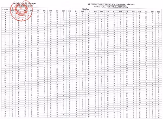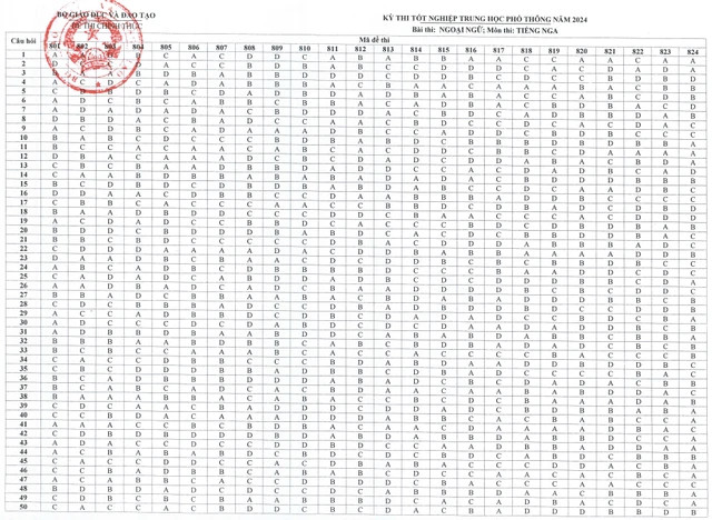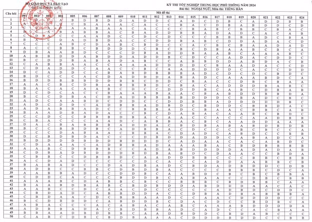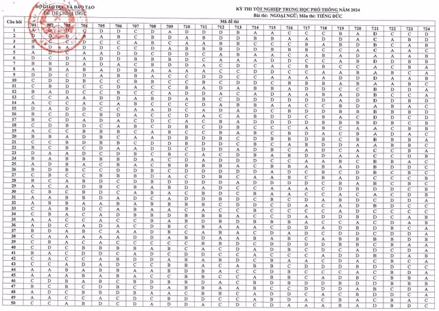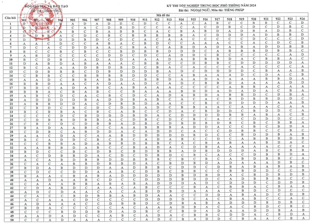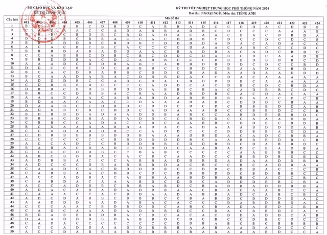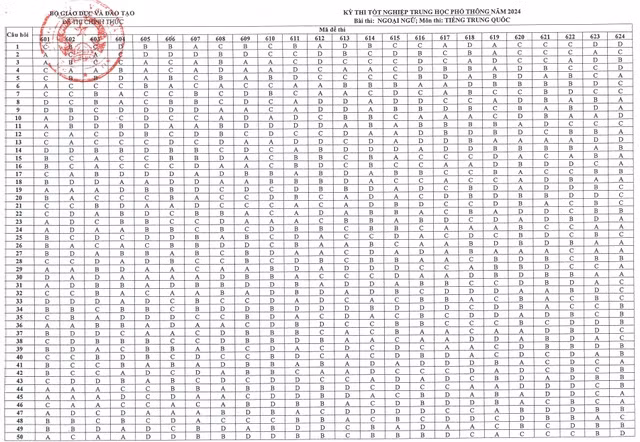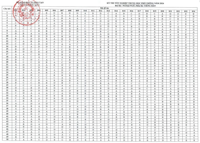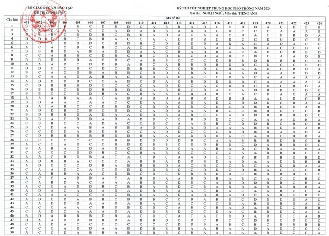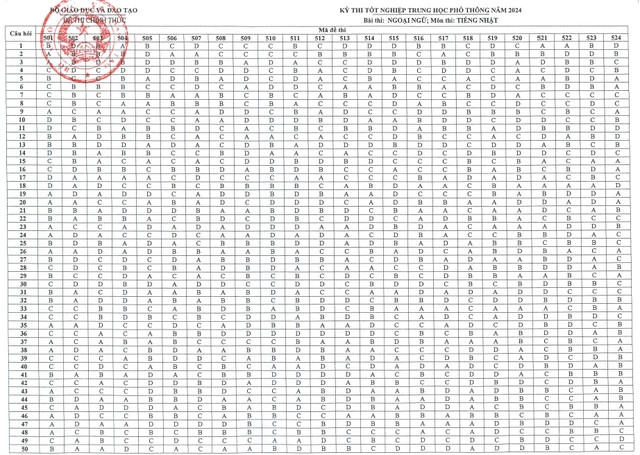 Chiều nay 2.7, Bộ GD-ĐT đã công bố đáp án chính thức tất cả mã đề các môn thi tốt nghiệp THPT 2024. Trong đó có các môn toán, lý, hóa, sinh, sử, địa, giáo dục công dân, ngoại ngữ, là những môn thi trắc nghiệm.
