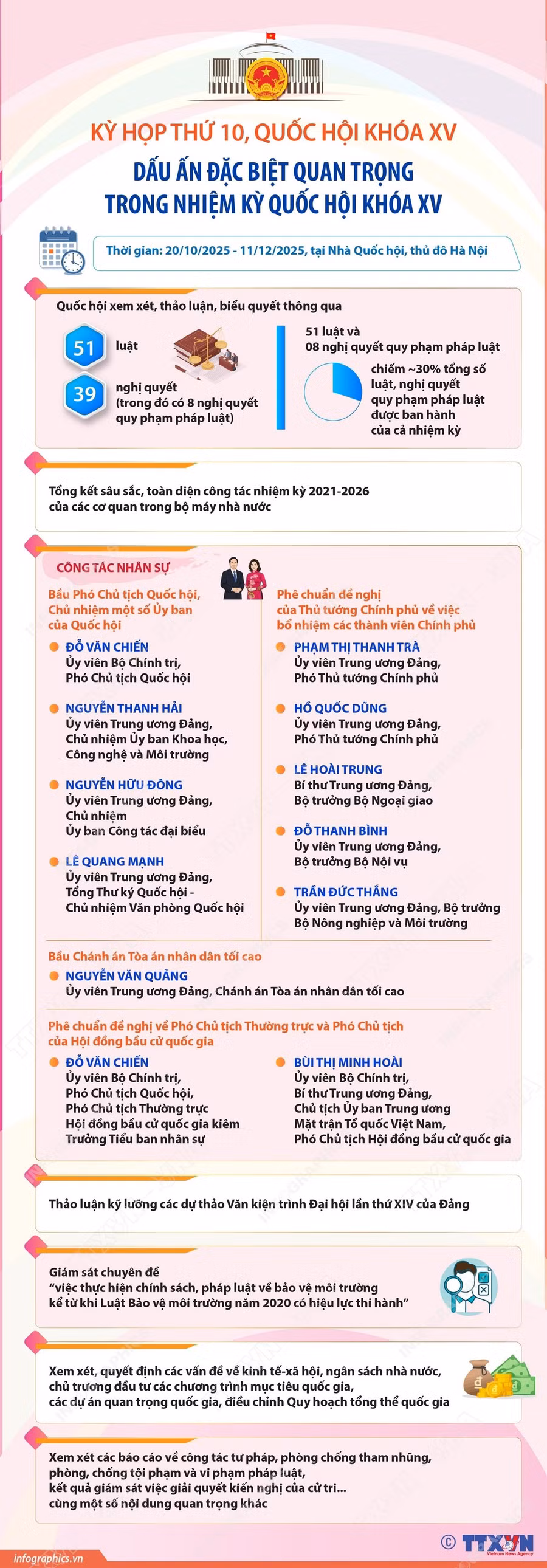 Tại Kỳ họp này, Quốc hội đã xem xét, thông qua 51 luật, 08 nghị quyết quy phạm pháp luật - đây là con số lớn nhất từ trước đến nay tại một kỳ họp Quốc hội; tiến hành tổng kết công tác nhiệm kỳ 2021-2026 của các cơ quan trong bộ máy nhà nước; xem xét, quyết định công tác nhân sự thuộc thẩm quyền; thảo luận, góp ý kiến về dự thảo Văn kiện trình Đại hội đại biểu toàn quốc lần thứ XIV của Đảng; xem xét, quyết định các vấn đề về kinh tế-xã hội, ngân sách nhà nước, chủ trương đầu tư các chương trình mục tiêu quốc gia, các dự án quan trọng quốc gia, điều chỉnh Quy hoạch tổng thể quốc gia./.