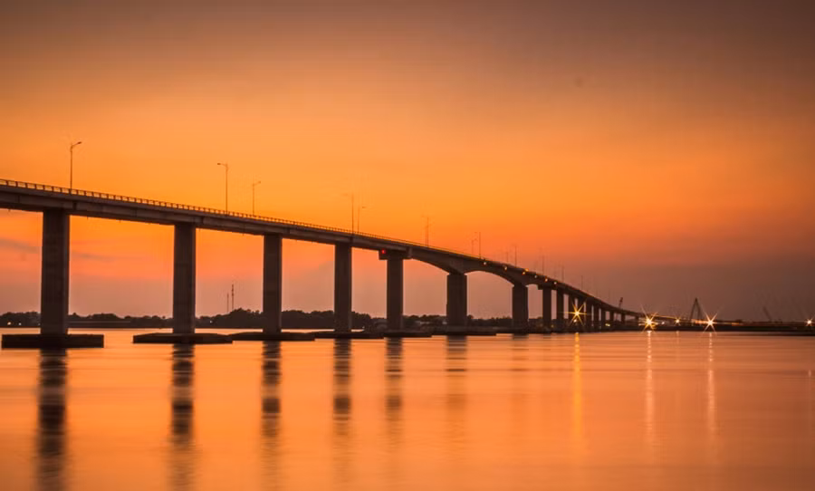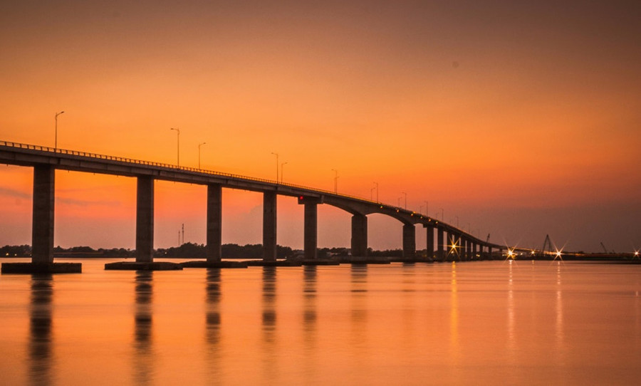 Khoảnh khắc hoàng hôn buông xuống trên cầu Mỹ Lợi - cây cầu quan trọng kết nối 2 tỉnh Long An - Tiền Giang. Nằm trên trục quốc lộ 50, cây cầu dài hơn 2,6 km, bắc qua sông Vàm Cỏ giúp rút ngắn đáng kể quãng đường từ TP.HCM đi các tỉnh khu vực đồng bằng sông Cửu Long, đồng thời giữ vai trò quan trọng trong sự nghiệp phát triển kinh tế và đảm bảo an ninh quốc phòng đất nước.